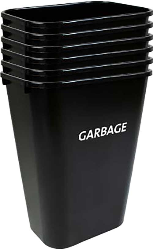14 Qt Black Wastebasket Labeled “Garbage” in White, 6 ct